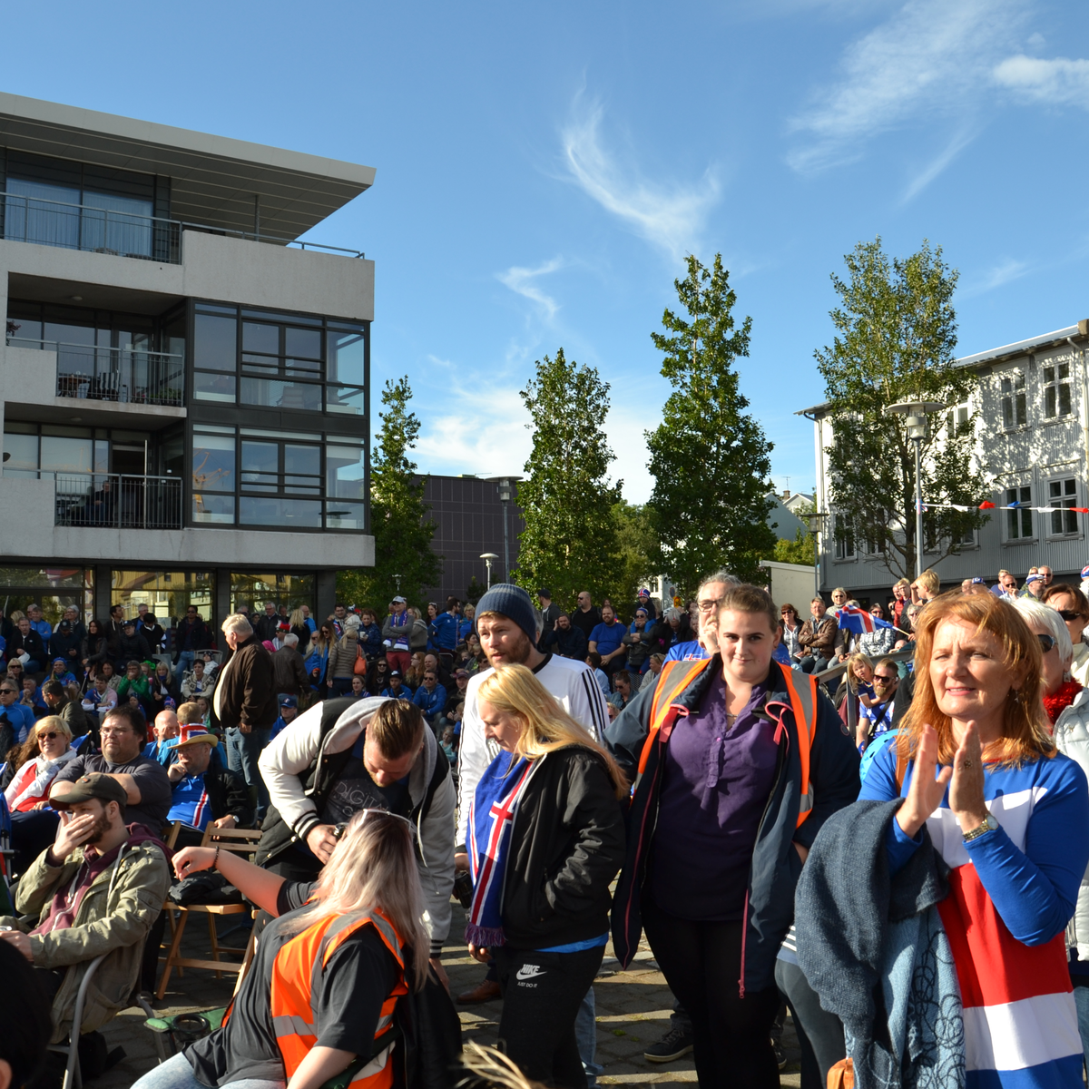 Fjöldi manns á Thorsplani að fylgjast með Íslandi spila á EM í knattspyrnu karla á risaskjá.