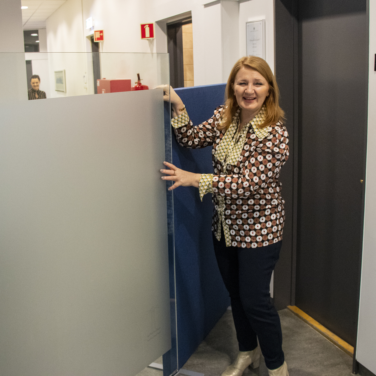 Rósa Guðbjartsdóttir bæjarstjóri tekur niður veggi sem skildu að sóttvarnarhólf í covid-19