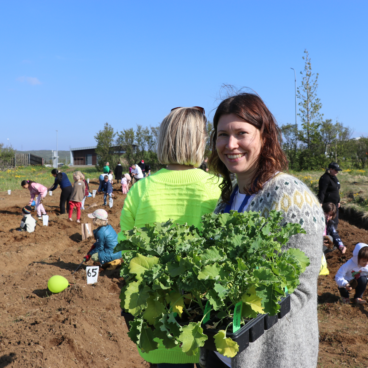 Hafnfirskar fjölskyldur og flóttafjölskyldur hittust í skólagörðunum við Öldutún síðdegis í gær í glaðasólskini. Þetta var opnunaviðburður fyrir uppskeruverkefni á vegum Hafnarfjarðarbæjar og GETA-hjálparsamtaka til að efla tengsl.